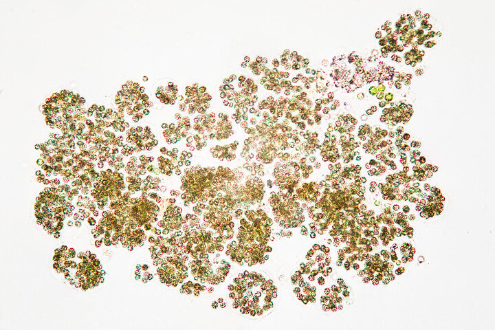 In some ponds and lakes you can even see individual microbial colonies floating freely. This picture shows a jar containing water from BBG's Japanese Hill-and-Pond Garden. Look closely at the jar—can you see tiny floating particles? Each of these thousands of particles is a colony of microscopic bacteria called cyanobacteria. If we put the colonies under the microscope, we can see the individual cells that form the colonies.
