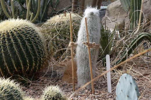 This common houseplant is native to Hidalgo, Mexico and endangered in its natural habitat. Its name comes from its white hairs, which are modified spines that help protect the plant from extreme sun and cold. Daley added wooden stakes and rope to help support this newly planted specimen. If they make the plant seem a little more anthropomorphic, that’s just a coincidence!