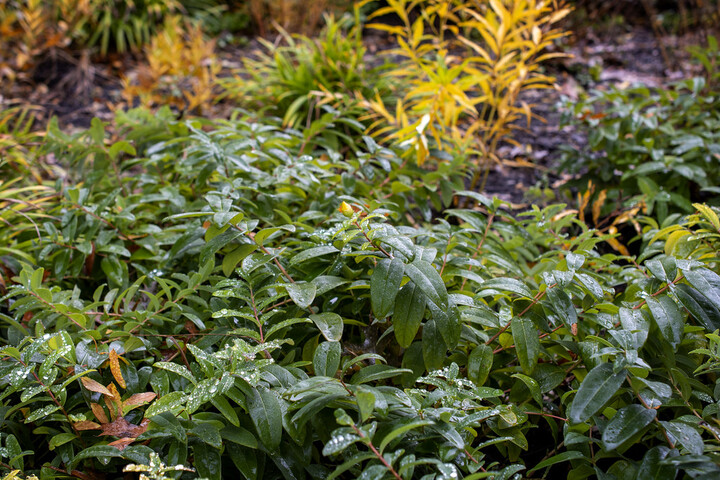 Native to wooded areas in western Korea, this understory shrub is planted for its loose, natural form and lush, fragrant foliage that turns shades of orange and a deep corally red in fall. By early winter, the narrow, smooth leaves become an even beige, and persist until early spring, weathering wind, ice, and snow with very little damage. As a result, the shrub can actually pop in the winter landscape against deep hues of evergreens. And take note, urban gardeners: Spicebush can be used as a loose privacy hedge—green in summer and tan in winter!