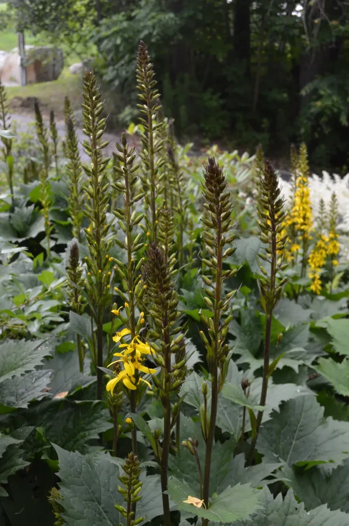It turned out that golden ragwort would become the star of this garden. It’s a speedy space filler and long-lasting bloomer, with brilliant yellow blossoms providing a strong spring presence. It was necessary to plant it in three repeating swaths for the sake of balance. While also yellow, ‘The Rocket’ is a bit more nuanced and blooms in later summer. It, too, is aggressive, so I placed its colony alongside the ragwort, hoping both would contend in the battle of space. The less intrusive winterberries are situated on the top of the slope, holding up the bank and perhaps providing a bit of winter color.