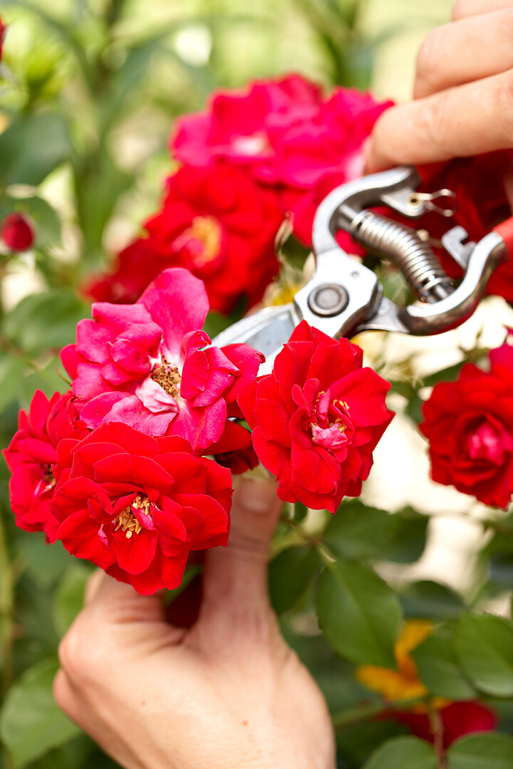 Removing faded flowers encourages new blooms and maintains a clean look. Because most roses repeat bloom from spring until late fall, keeping up with deadheading can be a chore. One way I get this done is by twisting off old flowers with my hand each time I walk by (slipping on a garden glove first helps protect against scratches). If a rose flowers so densely that removing each bloom would take forever, clip the whole plant back a few inches with hedge shears. In a couple of weeks, new flower buds will appear.