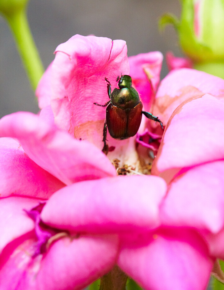Many roses attract butterflies, bees, and other beneficial wildlife. Of the insects that feed on roses, most do little enough damage that it's not worth treating for them because you'll often harm the pollinators, too. If the damage gets out of control, try using less toxic organic pest control options such as insecticidal soap to take care of the problem.