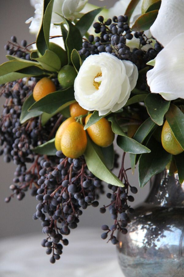 A vase full of sweet fragrances and muted colours will look fantastic to bring in the New Year. Kumquats and limes create a more tropical look and feel to the room which will be enhanced by their perfumes of jasmine and narcissus. It is a good idea to add a citrus plant to help with the arrangement of the flowers.