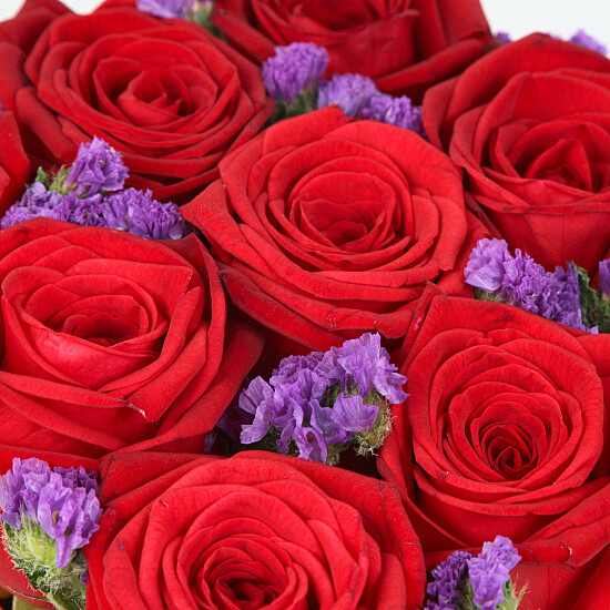 A modern twist to a traditional red rose bouquet, 9 passionate red roses embracing purple Limonium in a beautiful cube vase. £29.99 with free delivery*