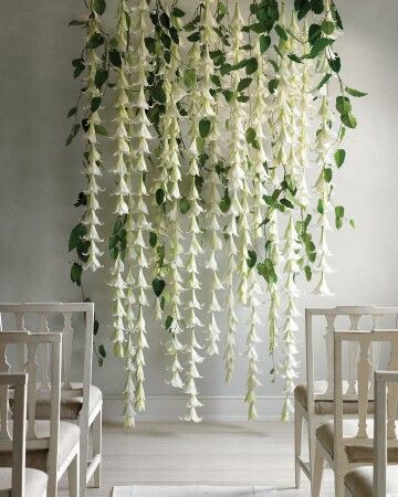 Asides from placing flowers on each and every part of the wall, for a simpler, more streamline display, create floor-to-ceiling hanging strands of flowers – a little like life-size daisy chains.