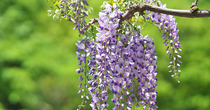 La glicina (wista'ria), una enredadera, es sagrada en Japón, donde sus flores púrpuras o azules son más honradas que las blancas. En los Estados Unidos, está entrenado para crecer sobre pasarelas, enrejados y árboles. Sus largos racimos de elegantes flores de color púrpura, lavanda, azul o blanco caen hacia abajo.