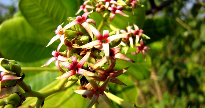 El anacardo es originario de América Central y otras regiones tropicales. Los primeros anacardos de la India se trajeron de América del Sur. En los Estados Unidos, los árboles de anacardo crecen principalmente en Florida. Los árboles a veces alcanzan una altura de 40 pies (12 metros). Tienen hojas grandes, coriáceas y verdes de hasta 6 pulgadas (15 centímetros) de largo y 4 pulgadas (10 centímetros) de ancho. Cada fruto del anacardo contiene una nuez. Además de la nuez, la gente come la base carnosa roja o amarilla de la fruta, llamada anacardo. La manzana se puede comer cruda o en conserva. Los árboles de anacardo también producen una goma utilizada en barnices.