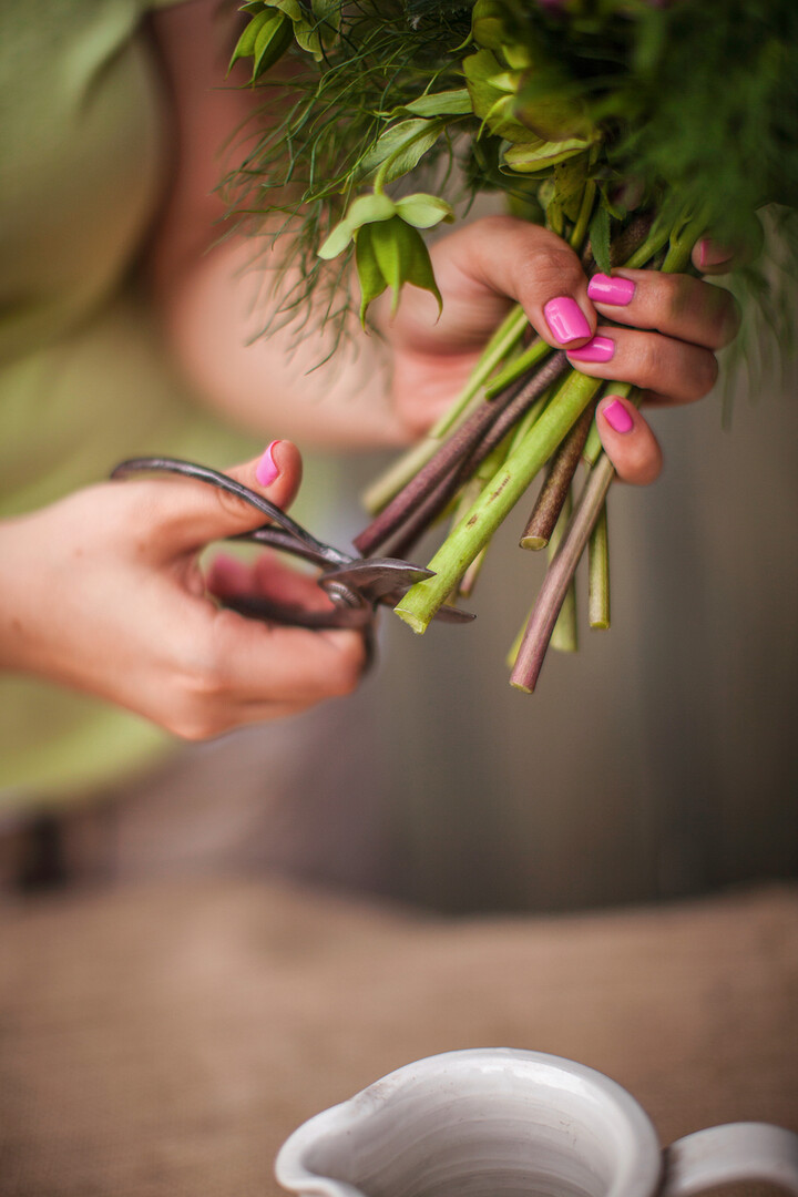After arriving home with your flowers, you might be tempted to begin arranging right away. However, there are some important steps to take to prepare flowers and make them last longer. First, remove extra leaves and damaged petals from stems. If there are unwanted buds on the same stem as a full flower, cut those off as well. Once the stems are cleaned up, make a fresh diagonal cut to the bottom of the stems. Put the trimmed stems into a vase or bucket of water (this doesn't have to be your final vessel) with cut flower food.