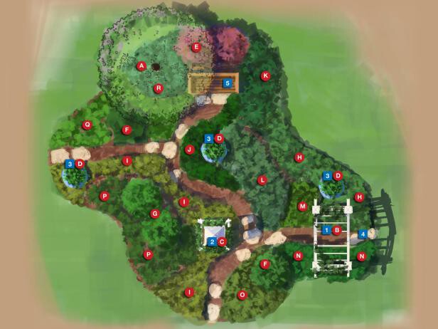 Immerse yourself in color! The landscape design plan creates an ever-changing collage of bold, vibrant hues in foliage and flowers throughout the seasons.