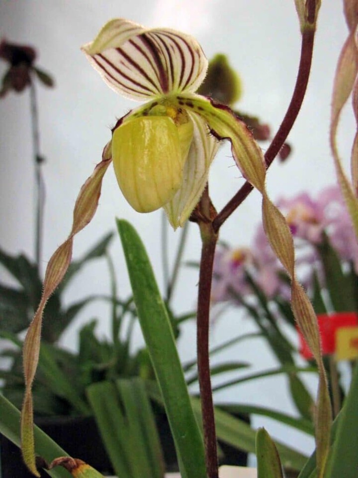 This particular Paphiopedilum orchid reaches up to 20 cm tall. It features blue-gray mottled leaves that grow up to 14 cm long and 3.5 cm wide. It also showcases up to 25 cm long inflorescence that holds a single flower. The petals, which are distinctly characterized with green and purple veins, form curves in an s-shape.