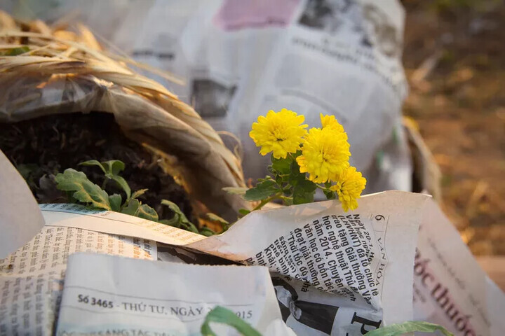 4. Stick the newspaper around the pots, filling in all the gaps.