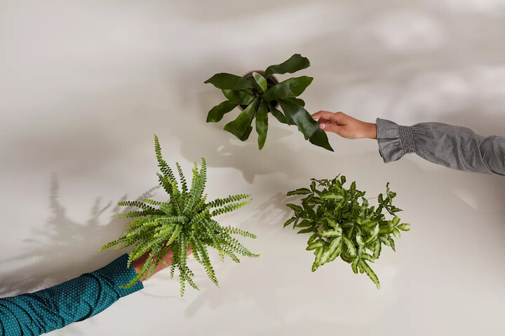 The Fur Friendly Collection (below) includes a fishbone prayer plant, a green peperomia, and a silver lace fern – all of which are safe for pets. They also share a love of medium indirect light and a desire for moisture.