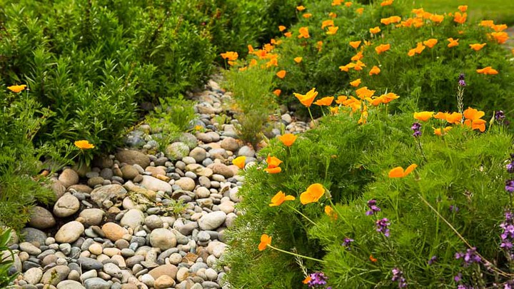 Growing ground covers and other perennials will hold soil in place naturally. If you’re in an especially wet part of the country or working with clay soils, adding a rain garden is not only helpful but beautiful.