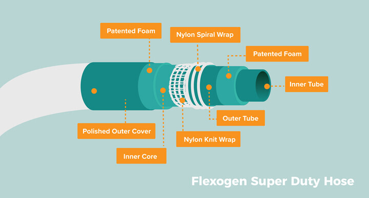 Gilmour’s Flexogen Super Duty Hose features a patented construction of foam layers that keep hose weight down while providing kink resistance. The tri-extrusion process adheres the layers to each other for the ultimate in strength and durability. The hose also features a protective outer cover that prevents abrasions when dragging it across the driveway.