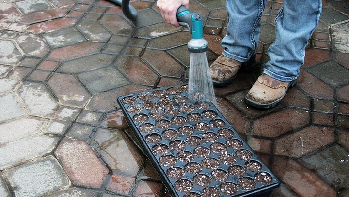 A good rule of thumb is to plant the seeds about as deep as they are wide and to use more per pot of the smaller seeds and fewer of the bigger ones. Water well with the “Flower” setting of your Gilmour Rear Control Watering Nozzle and pop the whole tray outdoors in a protected area—on the ground is better than on a paved surface. Check them every so often and water if the soil looks dry, and then wait for your seeds to sprout.