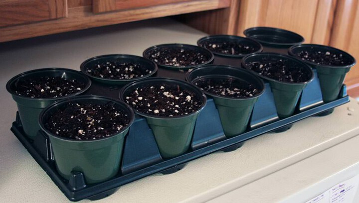 For the most basic setup, fill your containers with soil and place on a tray, plant the seeds, water gently and put the whole thing on top of the refrigerator—yes, the refrigerator. The heat from the appliance will encourage sprouting, and when the plants are up, you can move them to a sunny window.
