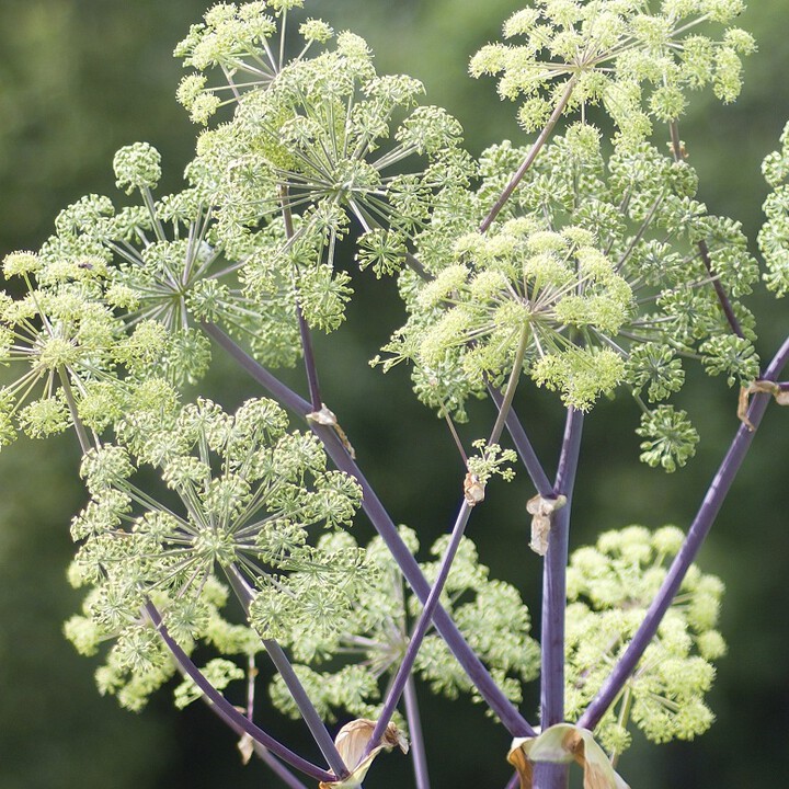 Both angelica root and seed have a deep, herby aroma with a spicy high note that leaves a lingering sweet and bitter scent. It is musty, quite sharp, and a little like celery with a touch of alcohol, yet hauntingly attractive. It could be a designer drink that combines celery and gin. The musty spiciness reminds me of walking through an East Indian bazaar rich with spices incense. Pinching either the leaf or stem releases a lighter version of the same unique aroma.
