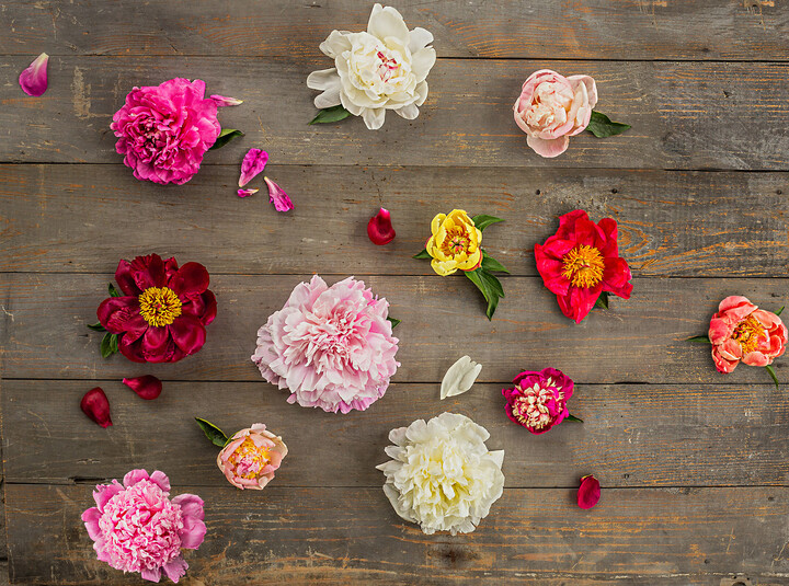 Peonies thrive with full sun and well-drained soil in zones 3–8. Plant them 2 to 3 feet apart, keeping the crown of the roots even with the soil surface. (Fall is best.) Wait at least two years, ideally three, to cut blooms.