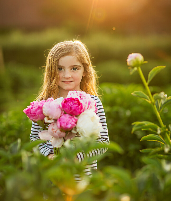 Josh and Lindsey's niece, Charlotte, holds ‘Sarah Bernhardt', ‘Dr. Alexander Fleming', ‘Duchesse de Nemours' and ‘Pink Parfait'.
