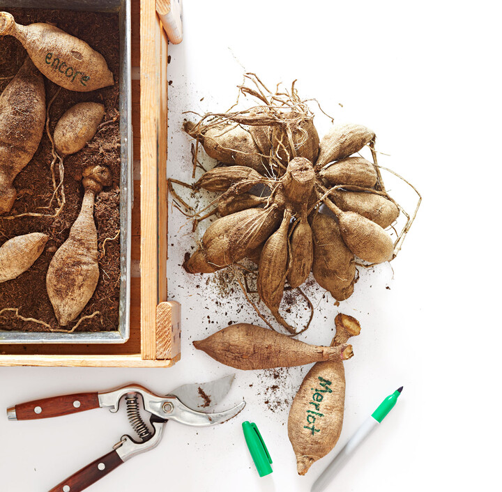 2 Divide Divide big clumps in half through the stalk. Place in a Styrofoam box or crate. Cover with vermiculite or a combo of newspaper and pine shavings. Store in a cool spot, such as a basement. (Check occasionally; mist lightly if shriveling.)