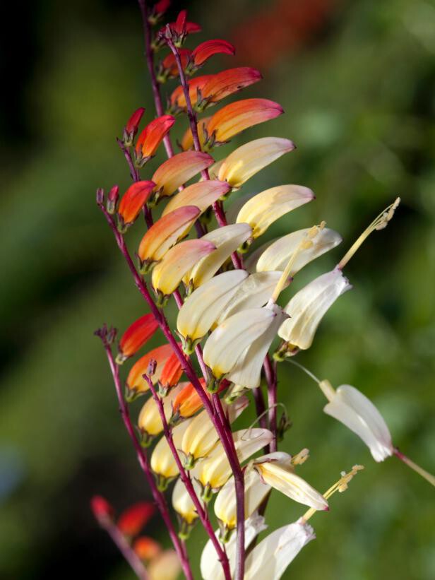 Firecracker vine, or exotic love (Ipomoea lobata, formerly Mina lobata). The tubular flowers of this vigorous Mexican native open scarlet and age to orange, then creamy yellow, with all the colors present along a spray. It climbs up to 20 feet.