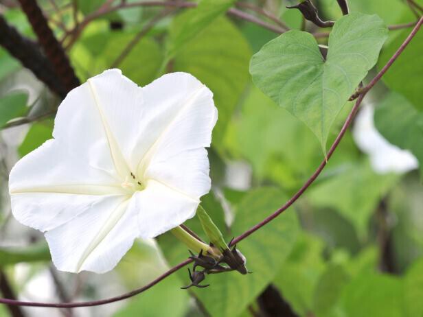 Moonflower, or moon vine (Ipomoea alba). Six-inch-wide sweetly fragrant, silky white trumpets open at sunset and fade the next morning. The heart-shaped leaves form dense foliage on twining vines up to 15 feet