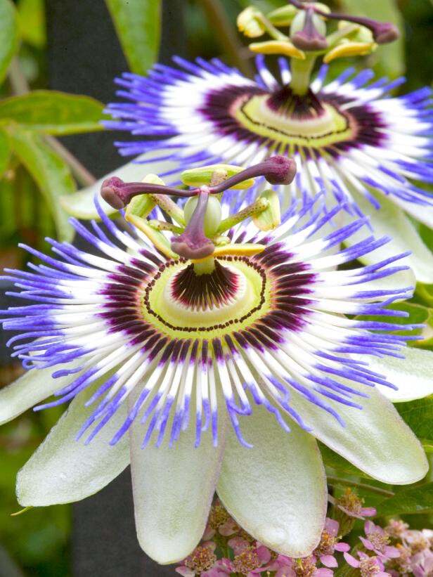 Passion flower (Passiflora). These spectacularly showy fringed flowers bloom on a vigorous tendril vine that can reach 20 feet. A tender perennial, the passion flower may die back in winter but will reappear in spring if the roots have survived. The blue, or common, passion flower (P. caerulea) has white and lavender flowers up to four inches wide and is hardy to zone 8. The maypop (P. incarnata), a native plant, has two-inch-wide mostly lavender fringed flowers and is hardy to zone 7. Maypops are often grown from cuttings, as the seeds can be tough to start.