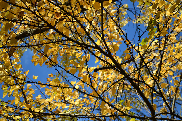 This is one of the oldest trees at BBG—it was planted in 1915. Stand back on the lawn and look at it from a distance to appreciate its elegant form. The multiple trunks form an almost perfect vase shape. It’s spectacular year-round, but it’s especially so in the fall because of its foliage. The color progresses in bands from yellow to orange, then to pink and red. Since the leaves are heart shaped, this creates a rainbow of hearts in autumn. The leaves also have a really pleasant, sweet fragrance in the fall, like brown sugar or cotton candy.