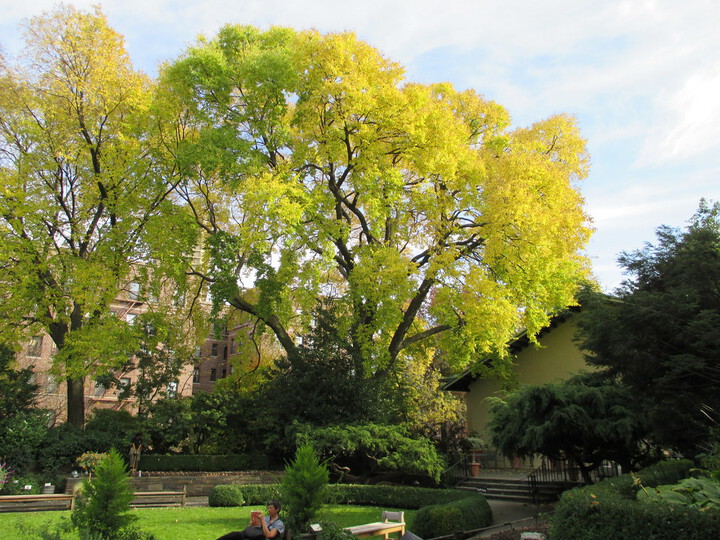 This native species is actually considered a weed tree by many gardeners. It can grow in really harsh environments, and you might find one growing out of a crack in the concrete. But this mature specimen proves what an amazing tree it can become, given the chance to thrive in the right place. Our records don’t tell us exactly when this one was planted, but it’s probably about 100 years old and very likely a volunteer tree—the classic ugly duckling that grew into a swan. It has a beautiful canopy that shades BBG’s Administration Building in spring and summer, a nice yellow fall color, and really interesting grayish, gnarly bark.