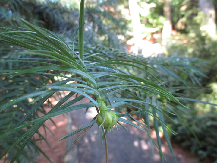 This gorgeous conifer is tucked away near the back gate that leads in from the Cherry Cultivar area of the Garden. One of the nicest perspectives for seeing it is from the path just across the pond. Look for a 40-foot-tall, straight-trunked, pyramid-shaped tree with blue-tinted foliage. As you walk along the path toward it, you’ll notice its smooth, reddish bark and a really nice fragrance coming from the older needles that have dropped to the ground. They smell kind of like cedar. This is also a great tree for birds to nest in—the sharp needles keep predators out. Cardinals, robins, and other year-round residents often take advantage of this feature.