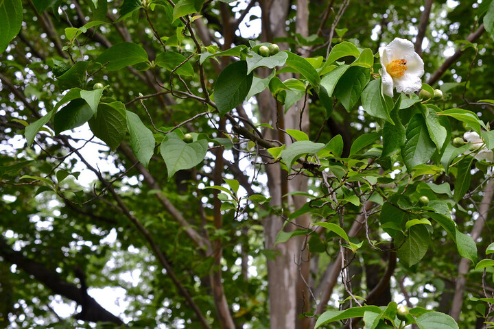 Walk along the path just above the stone wall on the east side of the Osborne Garden to see this beautiful small tree. It has something interesting going on year-round. Stewartias are related to camellias, and in the summertime, they produce similar white flowers, which attract a lot of bumble bees. It also has fantastic fall color. The leaf color progresses at different rates, even on the same branch, so you’ll see yellow, orange, and red simultaneously. It also has a really distinctive trunk and branches with multicolored, exfoliating bark that has flakes of yellow and red with green cortex visible beneath. This specimen is the largest stewartia in the Garden, and it’s older than you might think. It was planted in 1969 but has only grown to 35 feet tall. It’s a pretty slow-growing species in general, which is one of the reasons it’s getting more popular with home gardeners. Keep an eye out and you’ll start to notice more of them around.