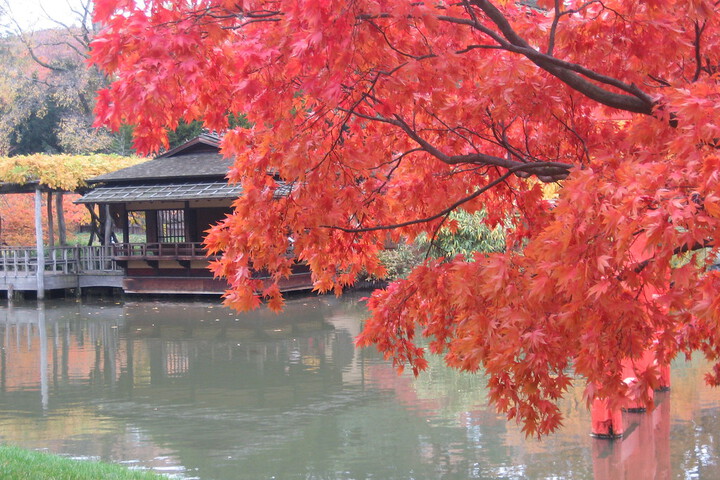The garden is a modeled after a traditional Japanese stroll garden, but elements of other historical styles have been incorporated into it. It was designed to be both viewed from a distance and explored on foot. Upon entering the pavilion from the formal entrance, you first experience the garden as a vista, composed as a painter would compose a painting. To the left is a dramatic vermilion-colored wooden torii, a traditional gate signifying that a Shinto shrine lies beyond. It emerges from the pond against a background of gently rounded hills and a wooded path. To the right, an arched bridge leads to a small grassy island, where a Japanese black pine has been pruned to look windblown and contorted with age.