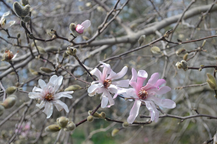Magnolias emerge from thick, hairy bud scales that protect them through the winter. The flowers are actually produced in autumn, which is why they’re able to bloom so early in spring. Early-blooming magnolias appear along with the earliest cherries, and because many blossoms are pink or white, people sometimes mistake them for cherries. However, the two are easy to tell apart.