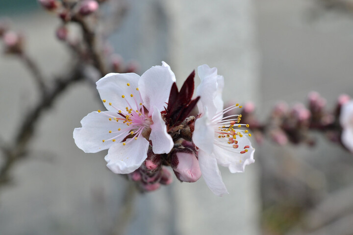 Apricots (Prunus armeniaca), peaches (P. persica), and nectarines (also P. persica) have showy spring blossoms that all resemble cherries. They may be white or pink, depending on the cultivar or hybrid. There are specimens in the Herb Garden, the Plant Family Collection, and elsewhere in the Garden.