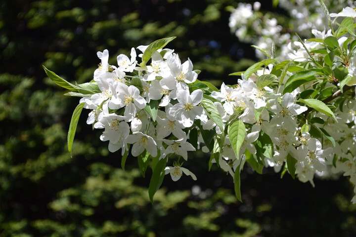 Crabapples (Malus species) and pears (Pyrus species) flower along with the later cherry species and also have blossoms very similar to those of cherries. (All are members of the Rosaceae, or rose family.) One way to distinguish them is to look at the bark: crabapples and pears have pale bark with vertical fissures. If you have a botanist’s eye for detail, you’ll also see differences in the flowers’ female parts: Cherries have a single style, while crabapple flowers have five. Brooklyn Botanic Garden has a lovely selection of Malus cultivars, many in the Osborne Garden, and there are pears in the Herb Garden and elsewhere.