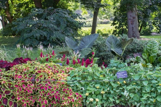 Moist conditions make me think tropical. Tropical perennials are often used as annuals in our region since they can't survive our winters. They provide a characteristic lush look and offer a variety of forms and textures. I chose some specimen plants to serve as focal points, along with some textural fillers, including elephant ear cultivars (Alocasia ‘Regal Shields’ and ‘Portodoro’) Skullcap (Scutellaria javanica ‘Veranda’), polka dot plant (Hypoestes phyllostachya ‘Splash Select Red’,) and coleus (Plectranthus scutellarioides ‘Giant Exhibition Multicolor’.